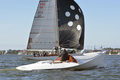 Erittäin ainutkertainen vene seurasi Pro Sail regattaa lauantaina. Aluksen nimen voi lukea peräpeilistä - Guggenheim. Poikkeavat linjat sopivat juuri alkaneen Helsinki Design - viikon teemoihin.