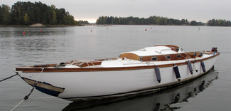 was imported in 2009 into Helsinki from Sweden. According to the owner she was marketed as a Swedish square metre cruiser, but nothing more was known. Looking at her lines – bow, flat rear and scantlines - she could be a särklass-boat, an early square metre cruiser or even a kubbregel boat. Not very much of the original details in the cabin exist anymore. The deck and cabin have been rebuilt. Some of the mountings and fittings are old bronze, some modern. The mast is straight, not curved at the top, and some of the fittings are very aged. My guess is that boat has been built at latest on 20´s, maybe !